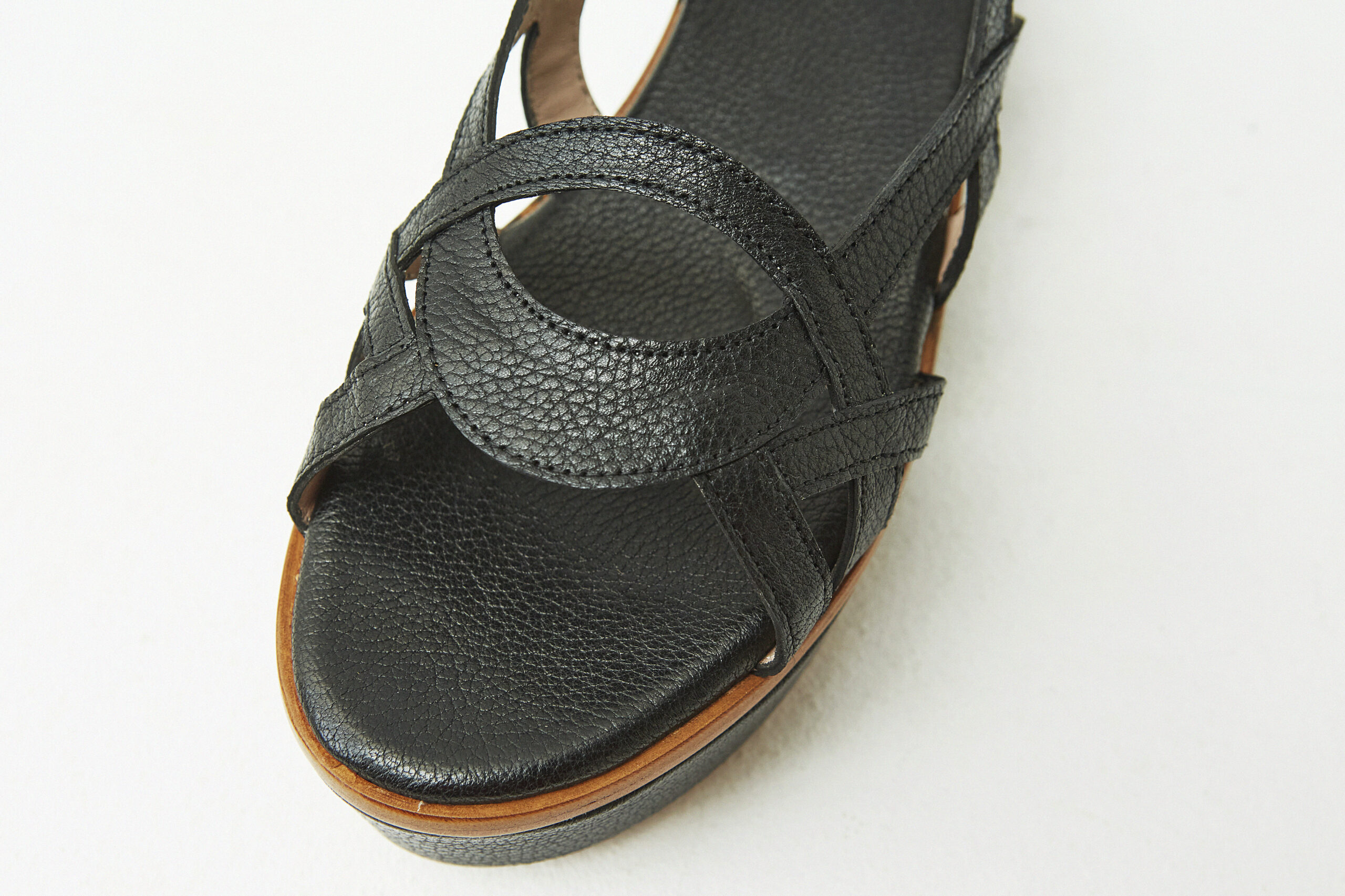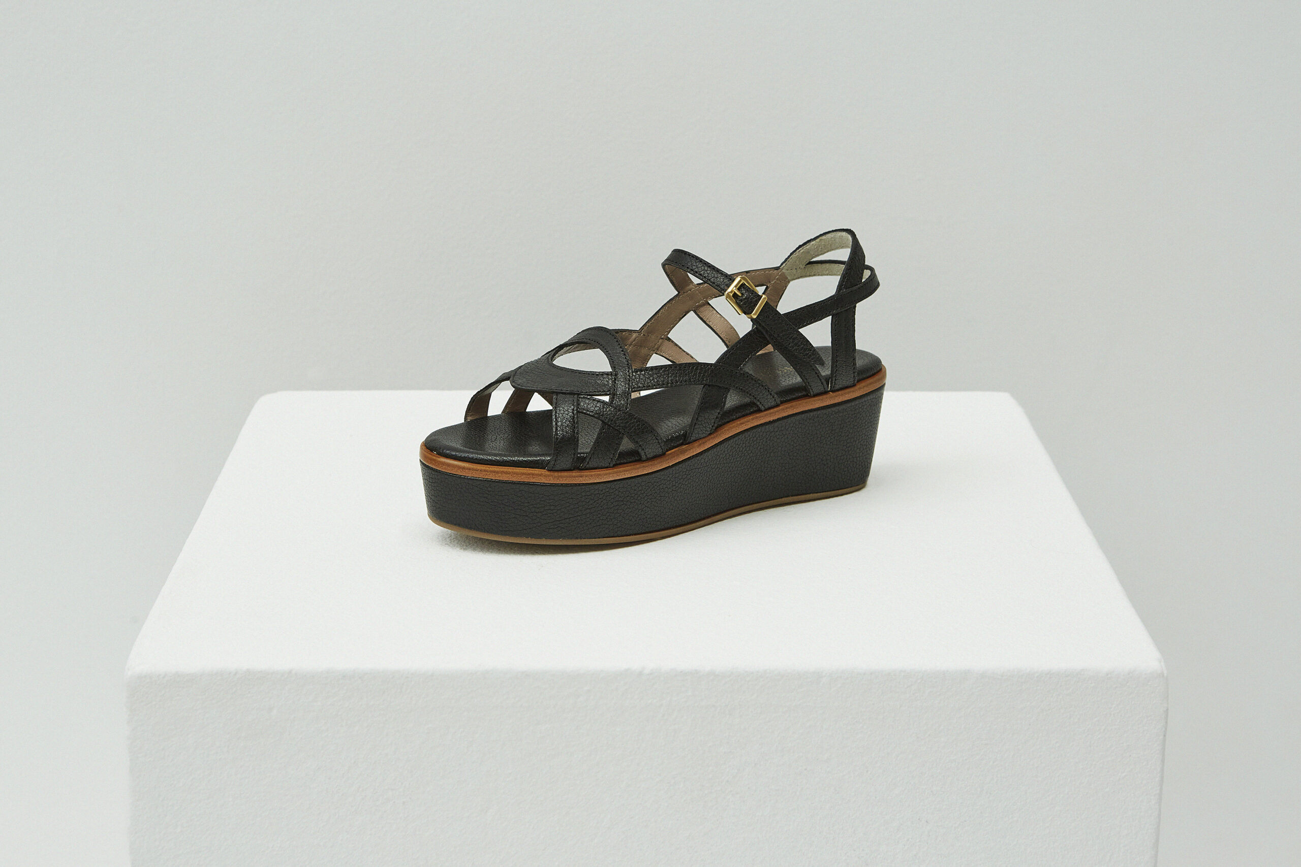 Greta is a romantic version of a platform model. This pair is handcrafted in Menorca in black calfskin. Designed with slender straps that crisscross around the instep, drawing lines like a vine, they give rise to greater support for the foot. Wear them with your work outfits, in the evening or at the weekend.