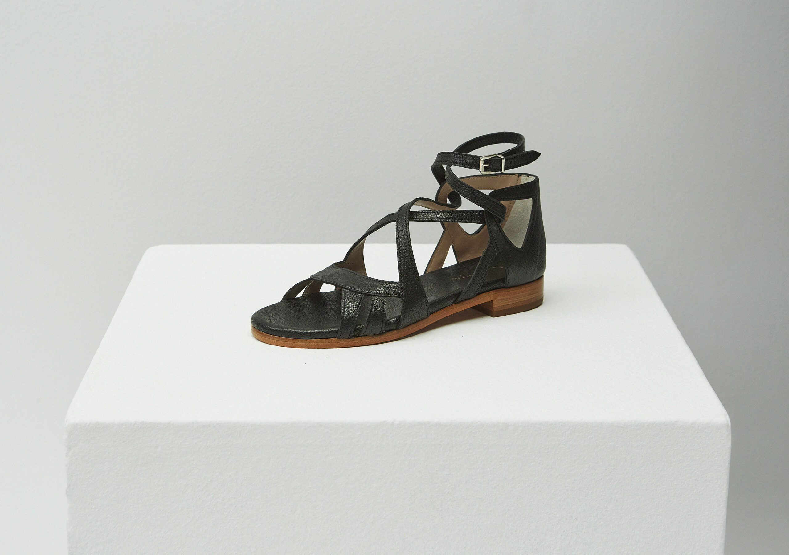 Las sandalia plana Adele tiene una silueta de tiras inspirada en estilos vintage/romántico. Fabricadas en Menorca de forma ética con una suave piel de becerro italiano en color negro.El tacón está fabricado a mano junto a la suela en color cuero natural de punta redondeada . La plantilla acolchada forrada de piel da un confort excepcional al apoyo del pie. Si estás buscando unas sandalias planas que puedas usar durante el día pero que también puedas utilizarla para ir a tomar unas copas con tus amigas, este es el modelo que deberías elegir. Lleva las tuyas con unos pantalones de lino anchos y una camisa.