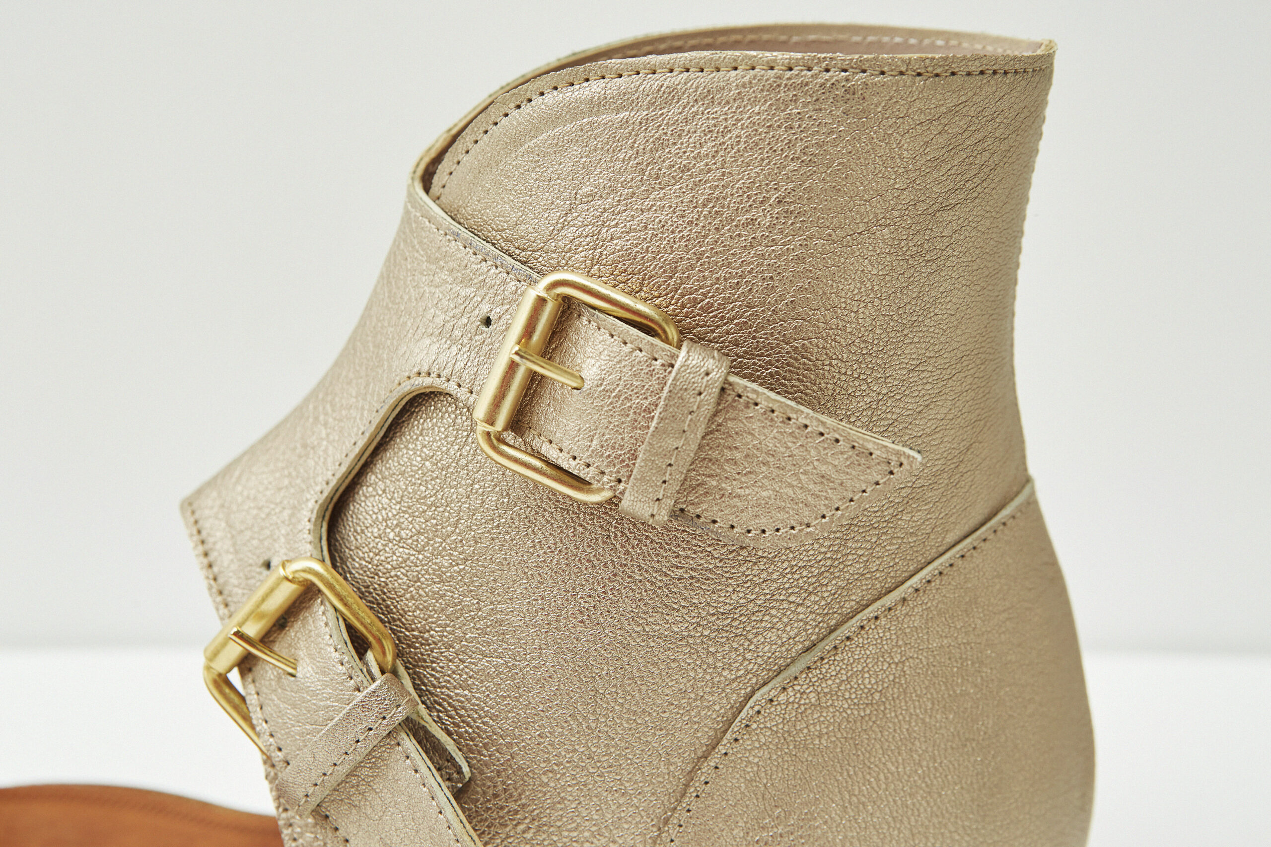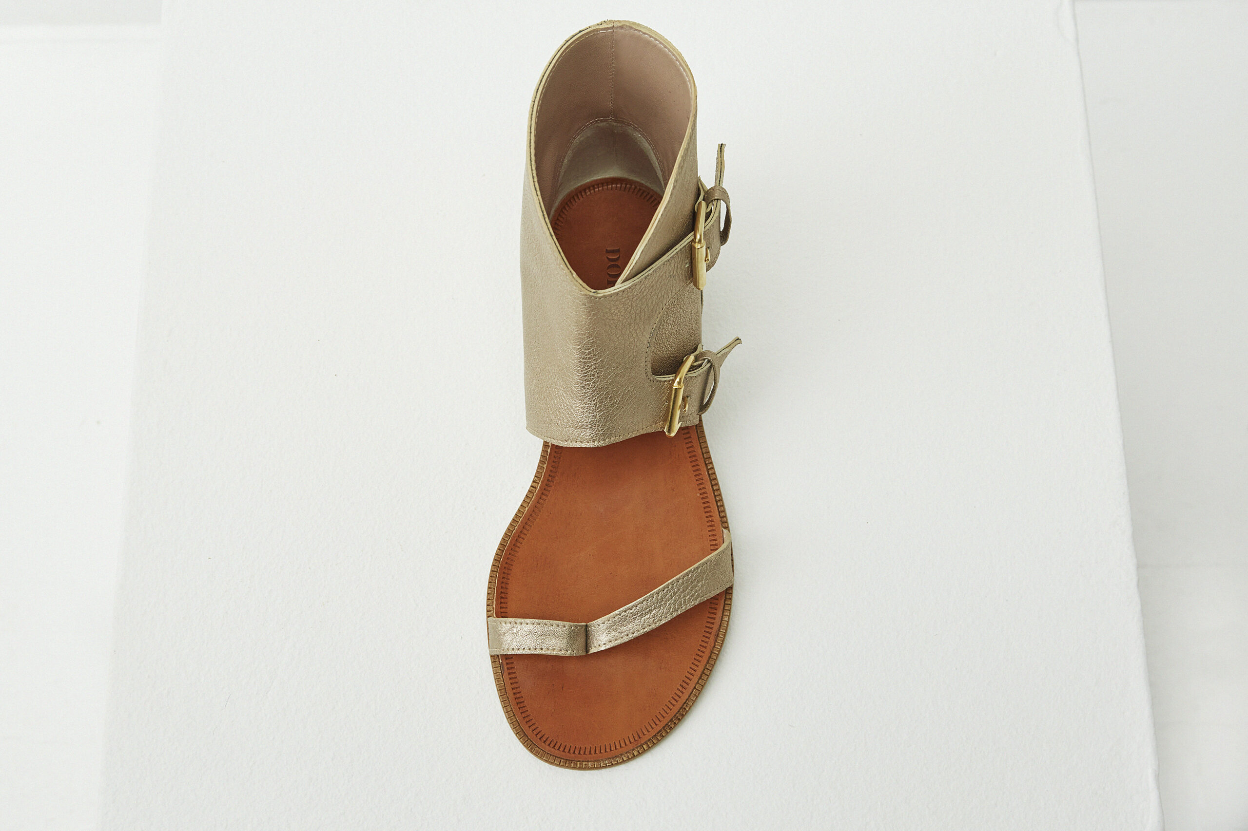 Gaia es una sandalia abotinada con un toque cosmopolita. De diseño atemporal y lineas nuevas está confeccionada en Menorca con una confortable piel de becerro laminado en color bronce claro. La planta de punta redondeada y en cuero junto con las hebillas aportara un twist a tus looks veraniegos. Atrévete y combina las tuyas con shorts o vestidos vaporosos.