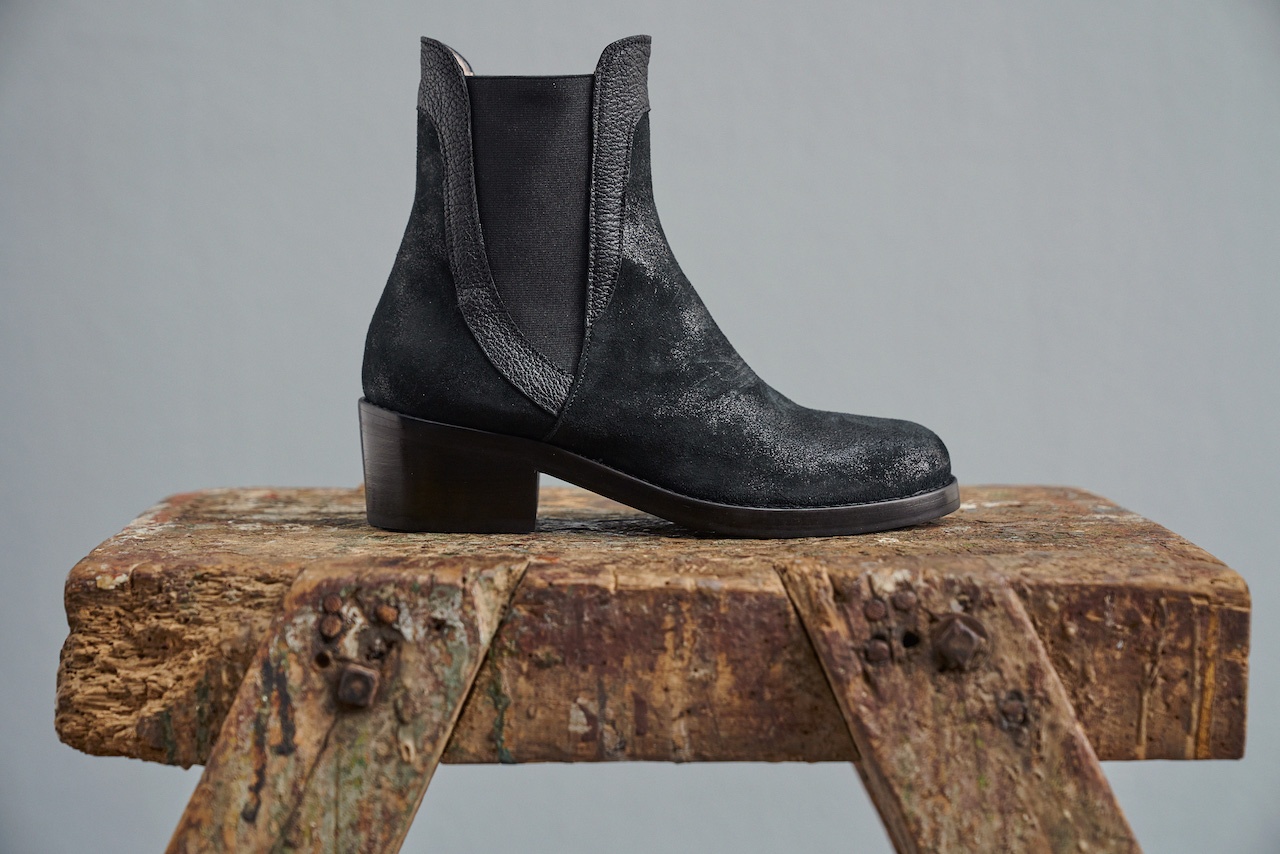 Los botines “Lola” tipo chelsea,son el modelo perfecto que te acompañará en tu día a día. Confeccionados, artesanalmente en Menorca, con una piel serraje con acabado engrasado y con una ligera purpurina plateada por encima de su color negro. Funcionales y todoterreno han sido diseñadas a base de piezas curvadas para jugar con los elásticos laterales. Combina los tuyos con pantalones rectos de lana.