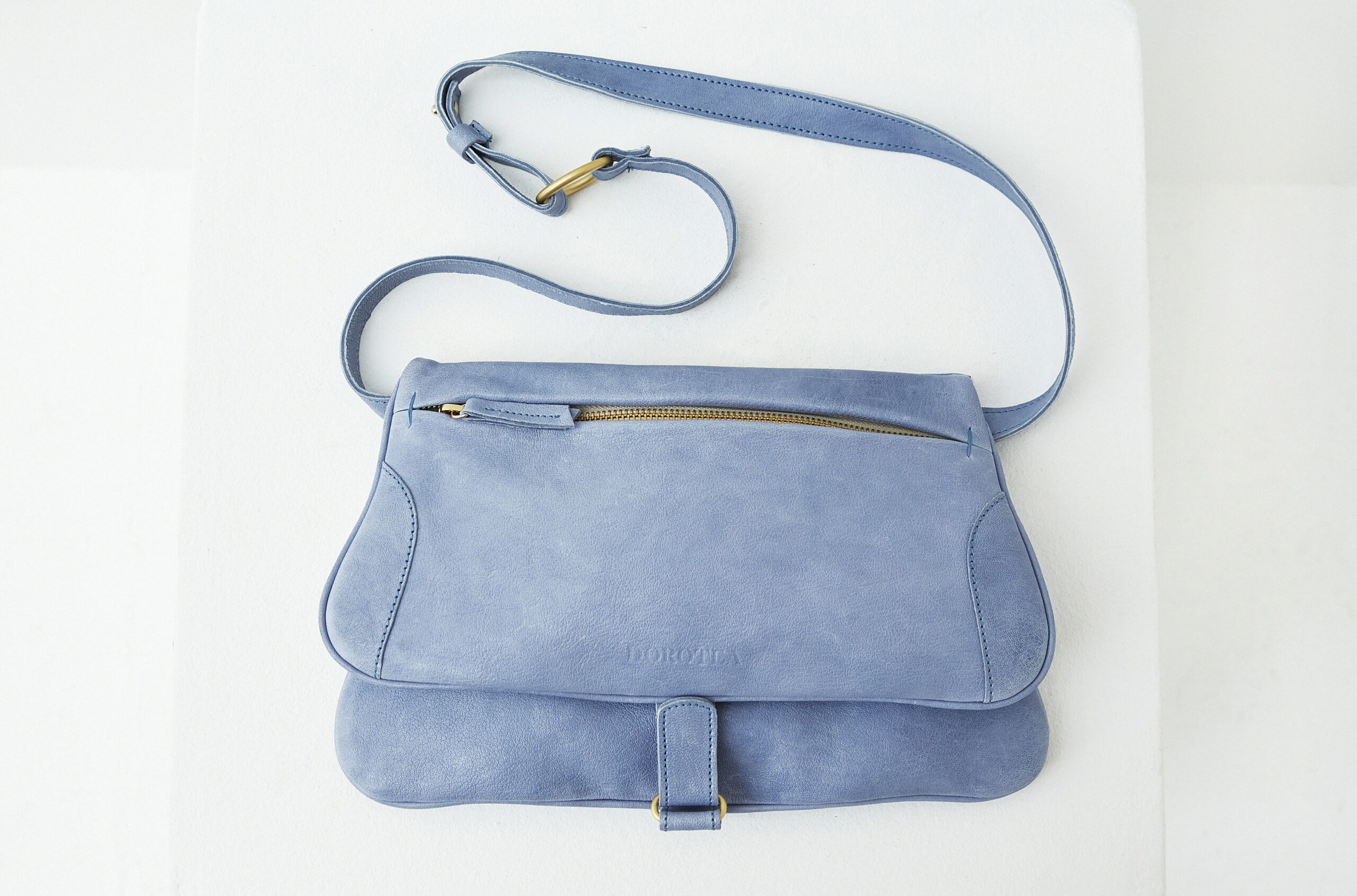 El bolso bandolera Naty es un modelo de silueta femenina de multi bolsillos con suficientemente espaciosa como para guardar todos tus objetos esenciales. Su diseño tiene una correa ajustable y una solapa frontal con cierre a de anilla . Su diseño sencillo y elegante con muchas cremalleras a modo de adorno se convertirá en tu mejor aliado. Confeccionado artesanalmente en Barcelona con una suave piel en color azulon jeans . El bolso Naty es el complemento perfecto para utilizar durante la semana o un paseo por la ciudad.